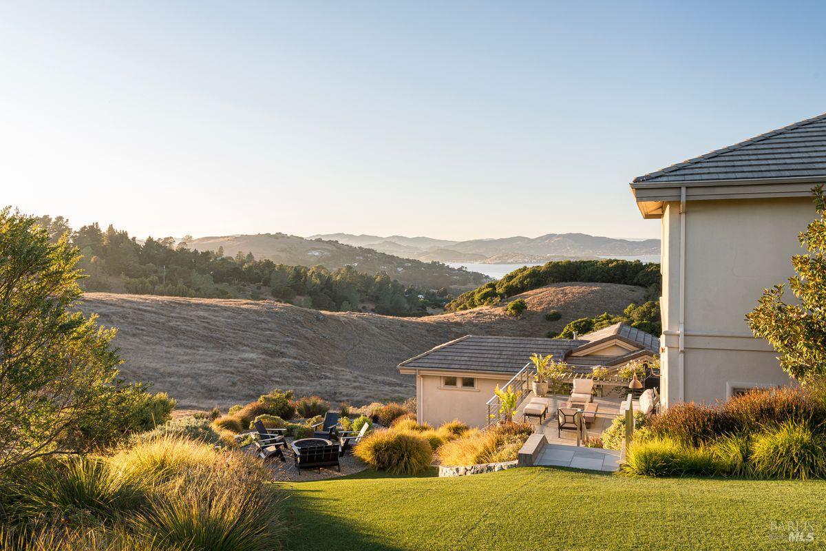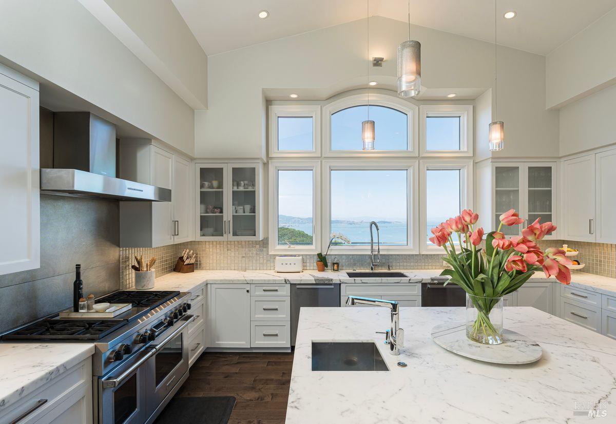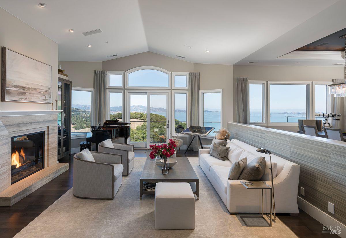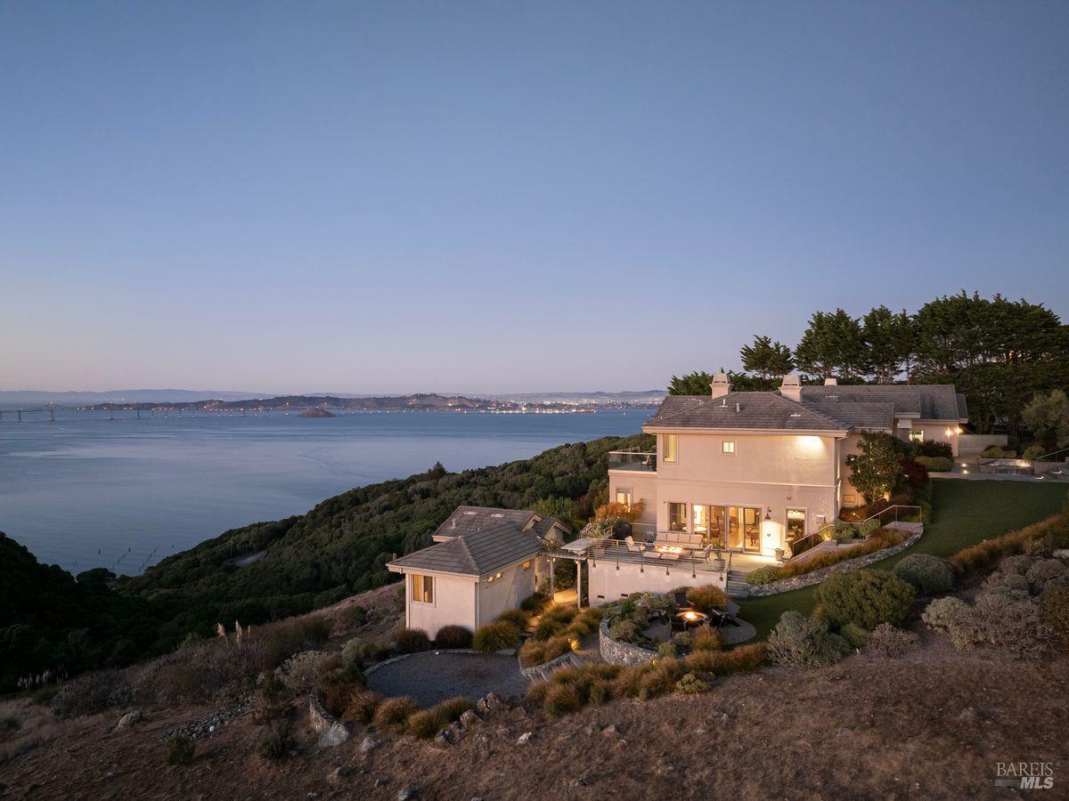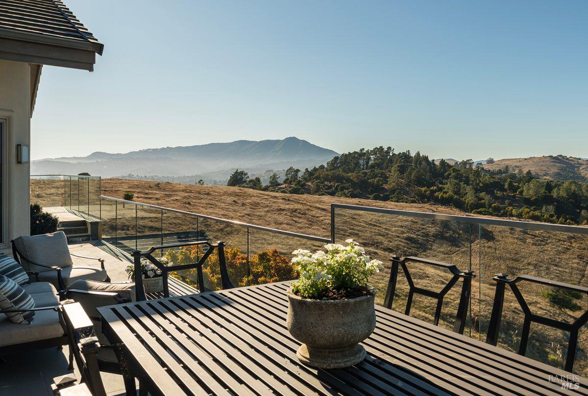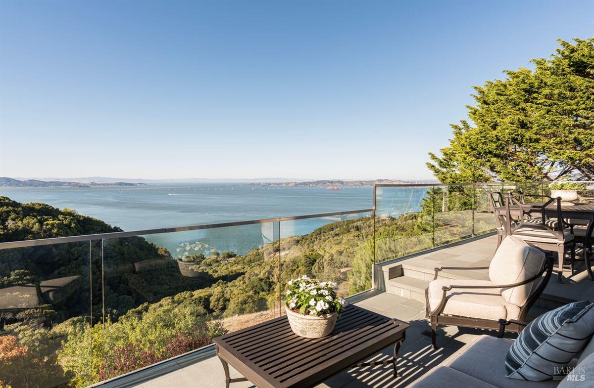 Situated adjacent to a large section of Tiburon’s protected open space, this captivating, recently remodeled estate captures sweeping 180-degree views of Mt. Tam, the Bay, and nearby rolling hills. The grand entry leads to the formal living and dining rooms and the captivating, recently remodeled estate captures sweeping 180-degree views of Mt. Tam, the Bay, and nearby rolling hills. The grand entry leads to the formal living and dining rooms and the stunning chef’s kitchen with Calacatta marble countertops, top-of-the-line stainless steel appliances, and an adjacent family room -- all offering the broad view-expanse. The main-level primary suite includes a private terrace and spa-like bathroom, while the lower level is designed for entertainment and features an expansive recreation area, including a wet bar, walk-in wine cellar, pocket-billiard and playing-card area, movie theater with plush seating for nine, and direct access to view-side terraces and two fire pits. The property also features a detached one-bedroom, one-bath guest house, perfect for visitors, extended stays, or to be used as a separate office suite.
