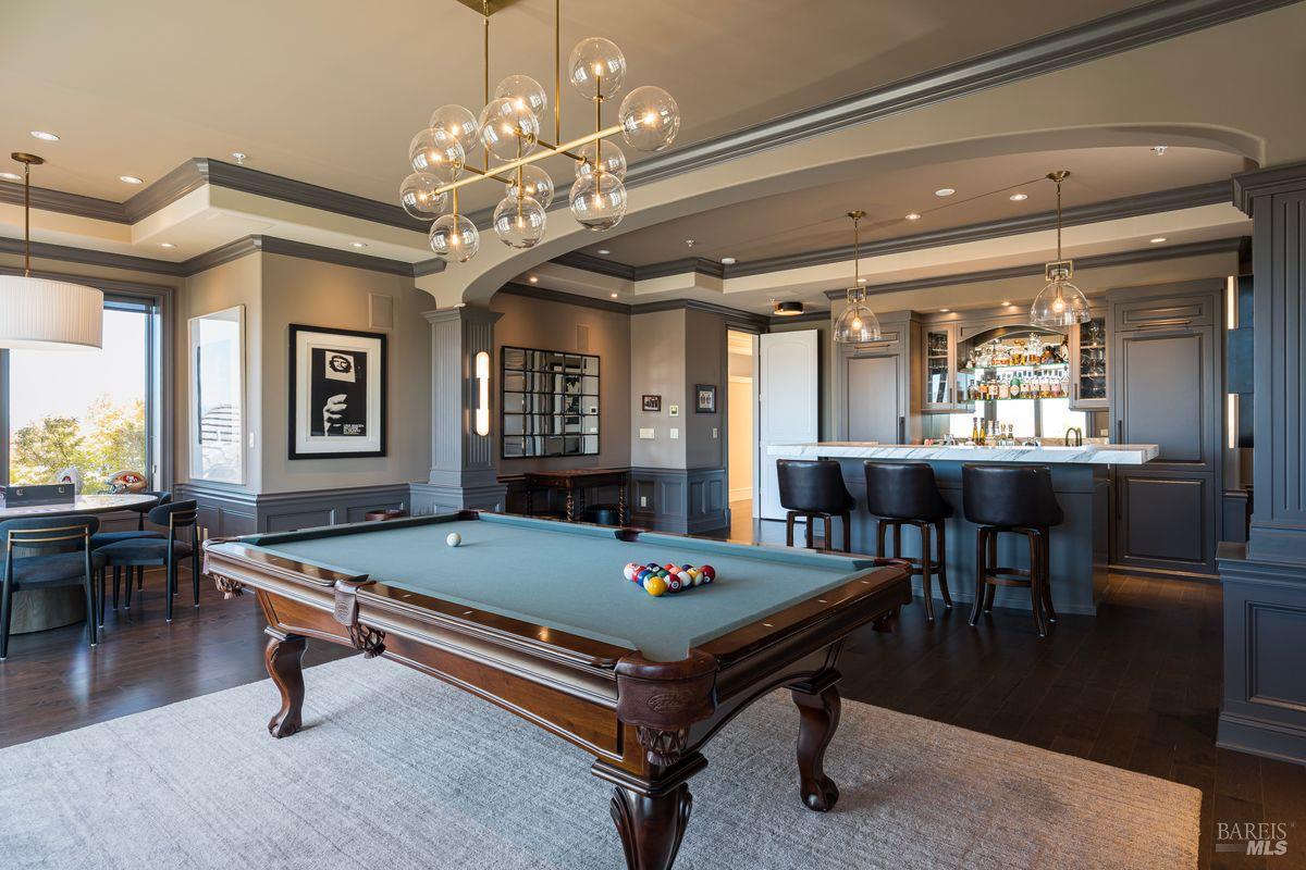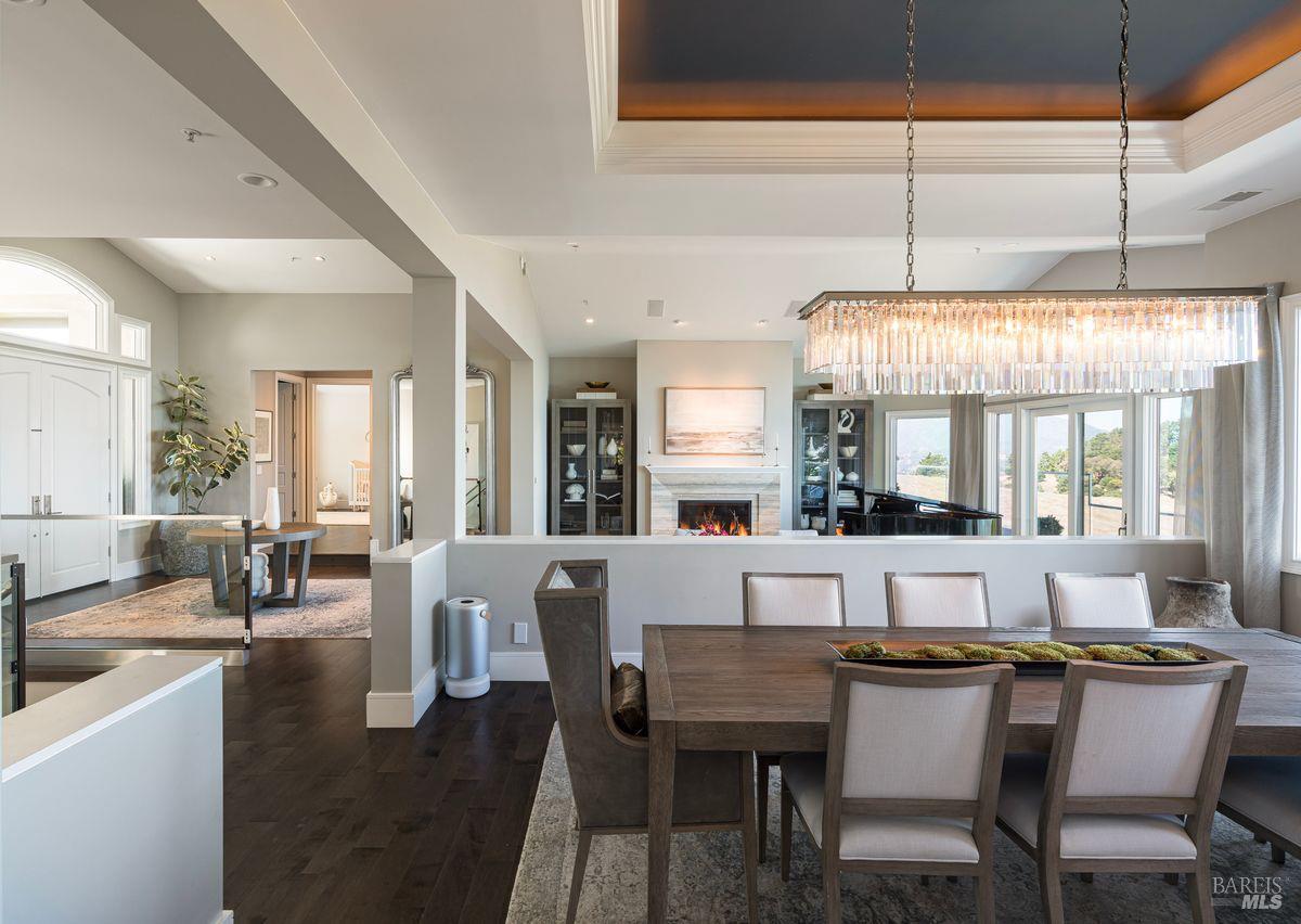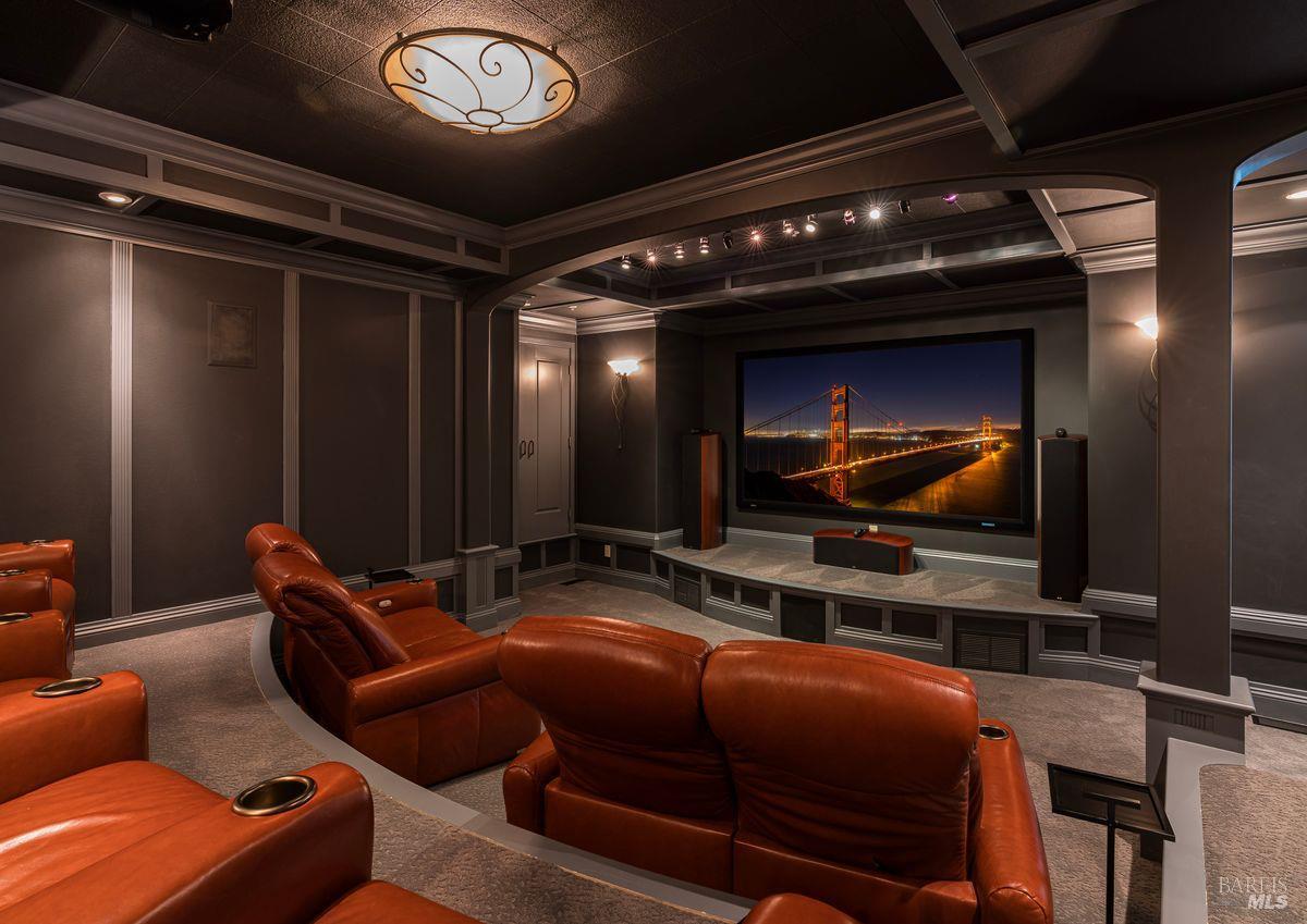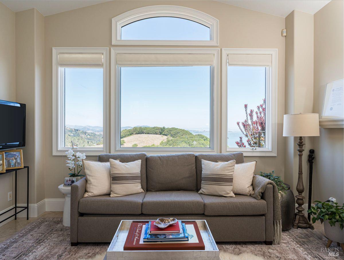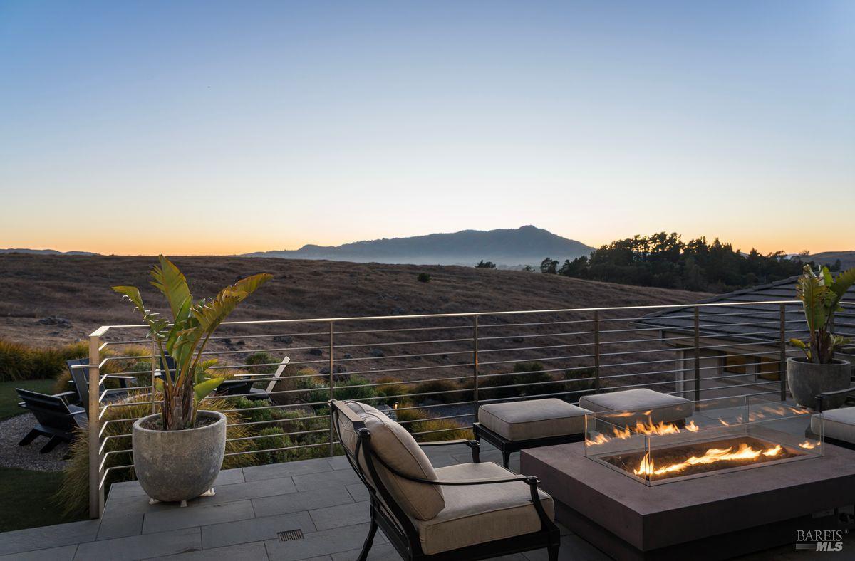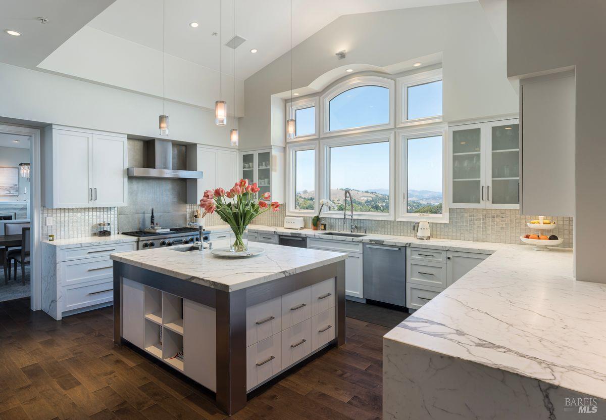 Situated adjacent to a large section of Tiburon’s protected open space, this captivating, recently remodeled estate captures sweeping 180-degree views of Mt. Tam, the Bay, and nearby rolling hills. The grand entry leads to the formal living and dining rooms and the captivating, recently remodeled estate captures sweeping 180-degree views of Mt. Tam, the Bay, and nearby rolling hills. The grand entry leads to the formal living and dining rooms and the stunning chef’s kitchen with Calacatta marble countertops, top-of-the-line stainless steel appliances, and an adjacent family room -- all offering the broad view-expanse. The main-level primary suite includes a private terrace and spa-like bathroom, while the lower level is designed for entertainment and features an expansive recreation area, including a wet bar, walk-in wine cellar, pocket-billiard and playing-card area, movie theater with plush seating for nine, and direct access to view-side terraces and two fire pits. The property also features a detached one-bedroom, one-bath guest house, perfect for visitors, extended stays, or to be used as a separate office suite.