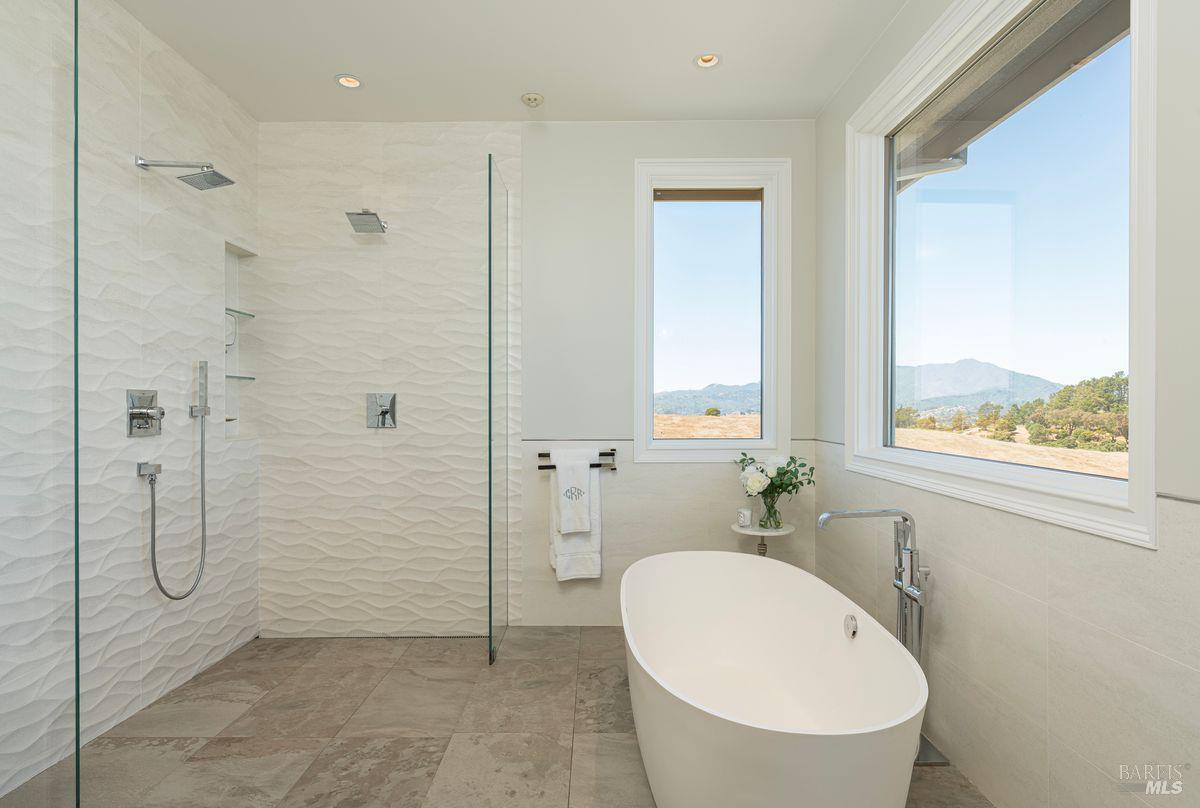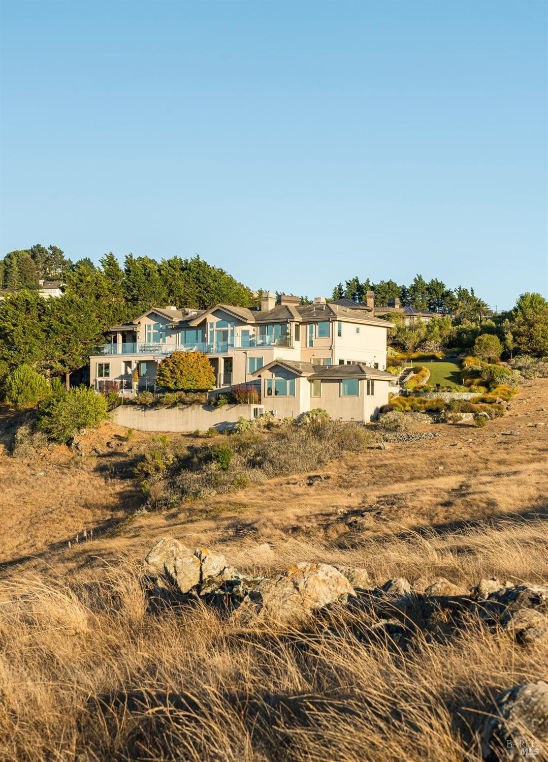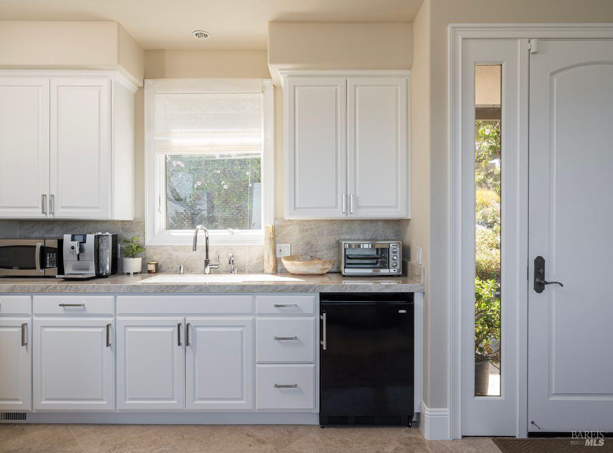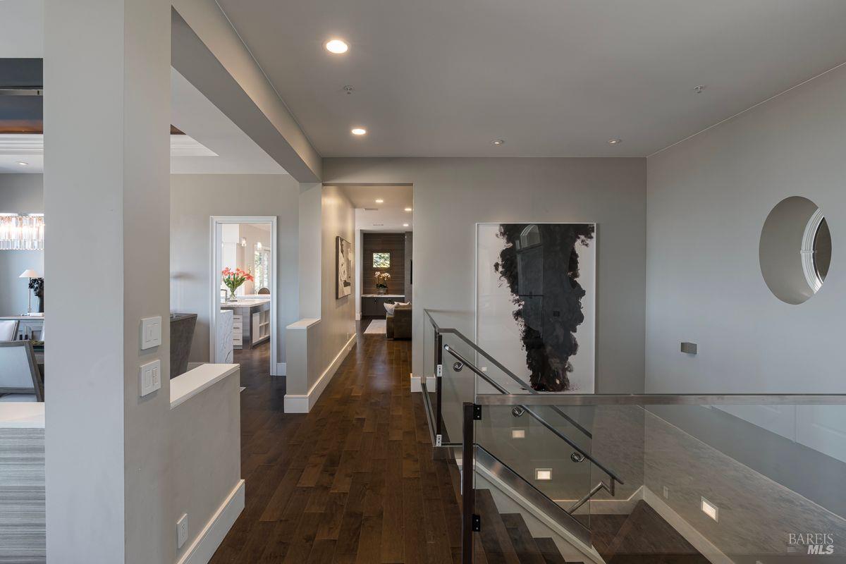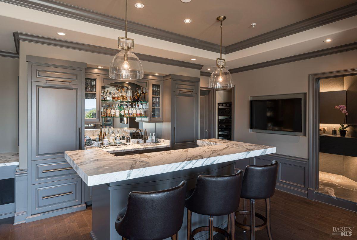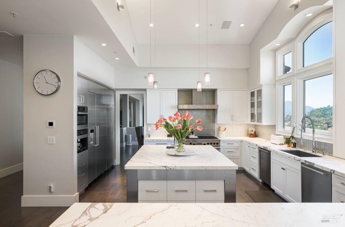 Situated adjacent to a large section of Tiburon’s protected open space, this captivating, recently remodeled estate captures sweeping 180-degree views of Mt. Tam, the Bay, and nearby rolling hills. The grand entry leads to the formal living and dining rooms and the captivating, recently remodeled estate captures sweeping 180-degree views of Mt. Tam, the Bay, and nearby rolling hills. The grand entry leads to the formal living and dining rooms and the stunning chef’s kitchen with Calacatta marble countertops, top-of-the-line stainless steel appliances, and an adjacent family room -- all offering the broad view-expanse. The main-level primary suite includes a private terrace and spa-like bathroom, while the lower level is designed for entertainment and features an expansive recreation area, including a wet bar, walk-in wine cellar, pocket-billiard and playing-card area, movie theater with plush seating for nine, and direct access to view-side terraces and two fire pits. The property also features a detached one-bedroom, one-bath guest house, perfect for visitors, extended stays, or to be used as a separate office suite.