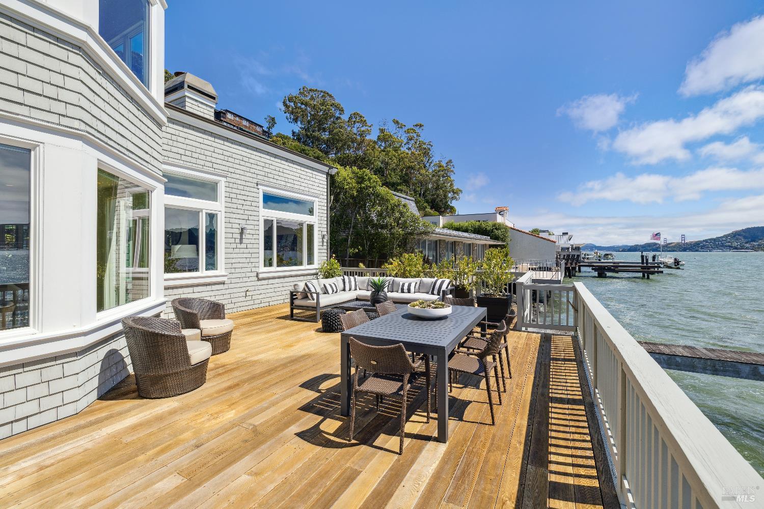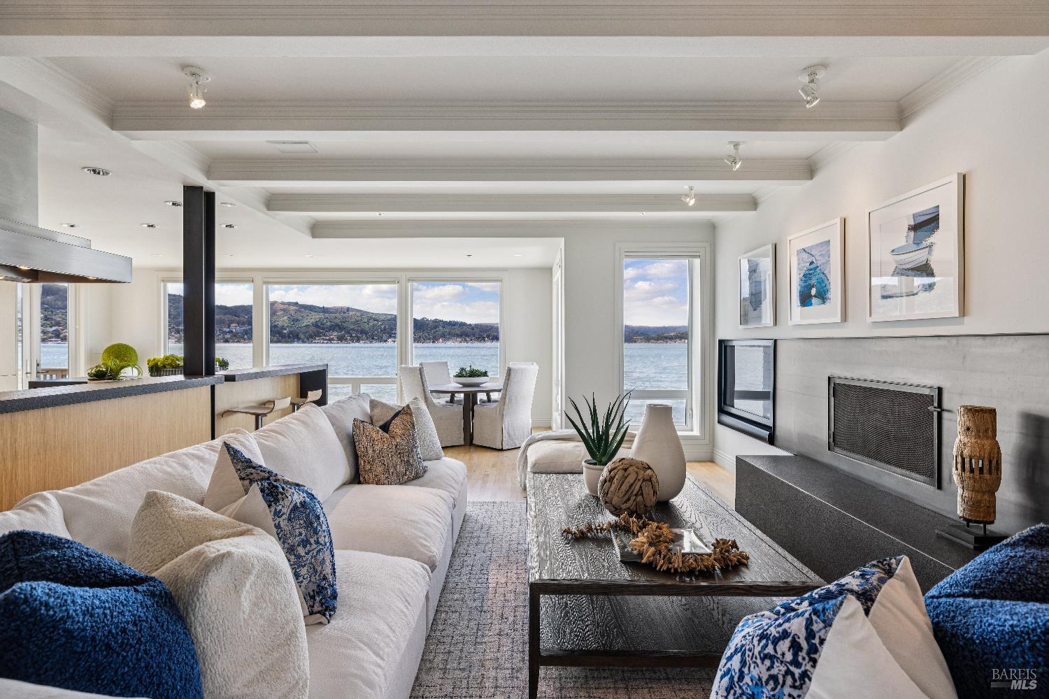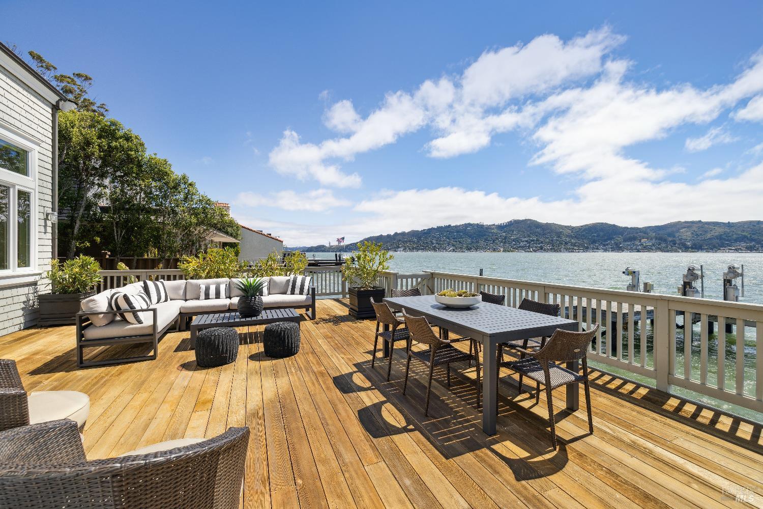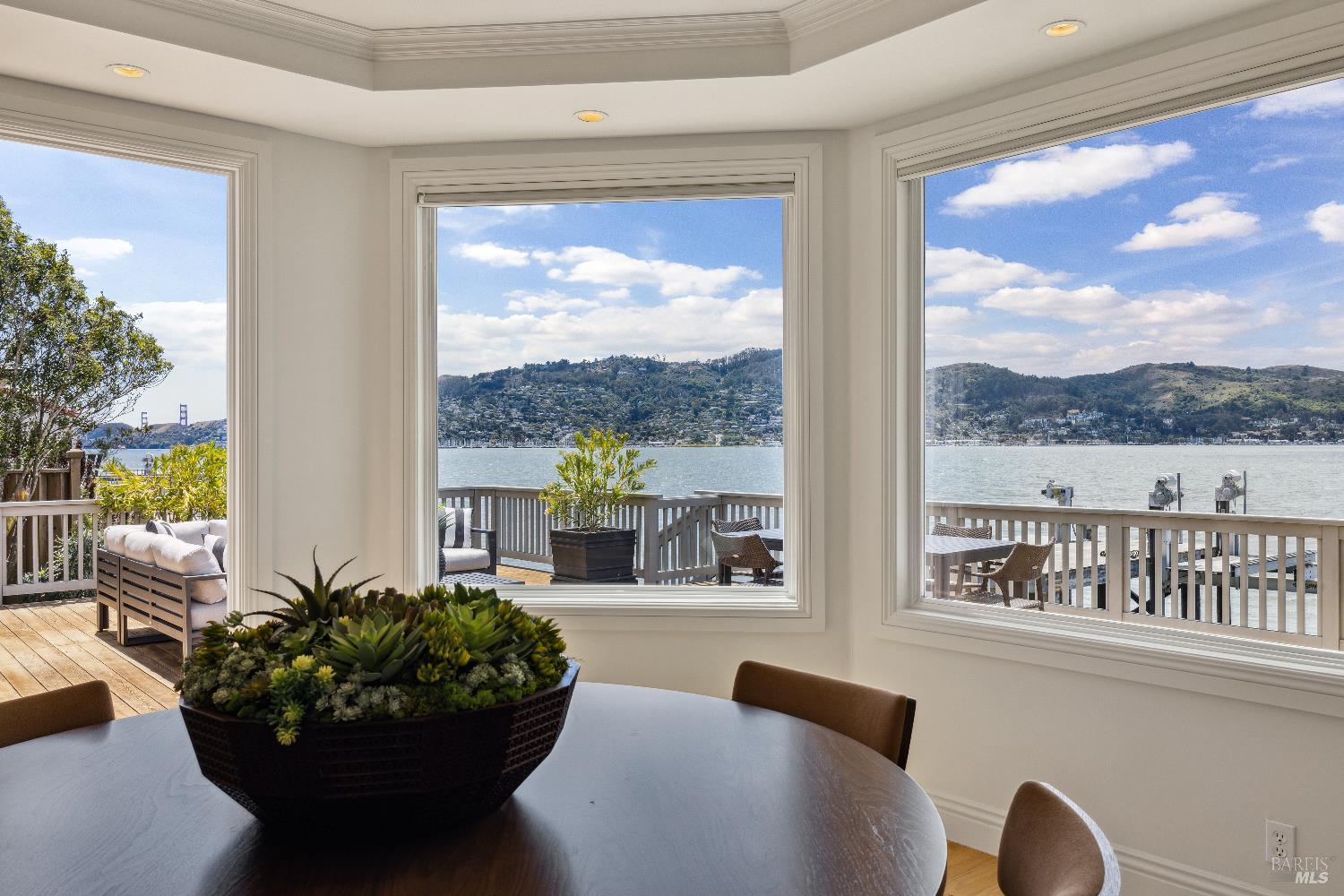 21 West Shore is one of Belvedere's most sought-after waterfront properties on Richardson Bay, with panoramic views of San Francisco, the Golden Gate Bridge, Sausalito, and Mount Tamalpais. Entered through a private gated garden, the grand entry and foyer opens to the living room with soaring ceilings and the dining room, both showcasing water views that command attention and pause. Ideal for entertaining and modern living, there is an open plan kitchen, breakfast area, family room, and game room with adjacent wet bar and wine cellar. The main level also features a view-side office/library, an ensuite bedroom, powder room, and an expansive deck leading to a private dock.