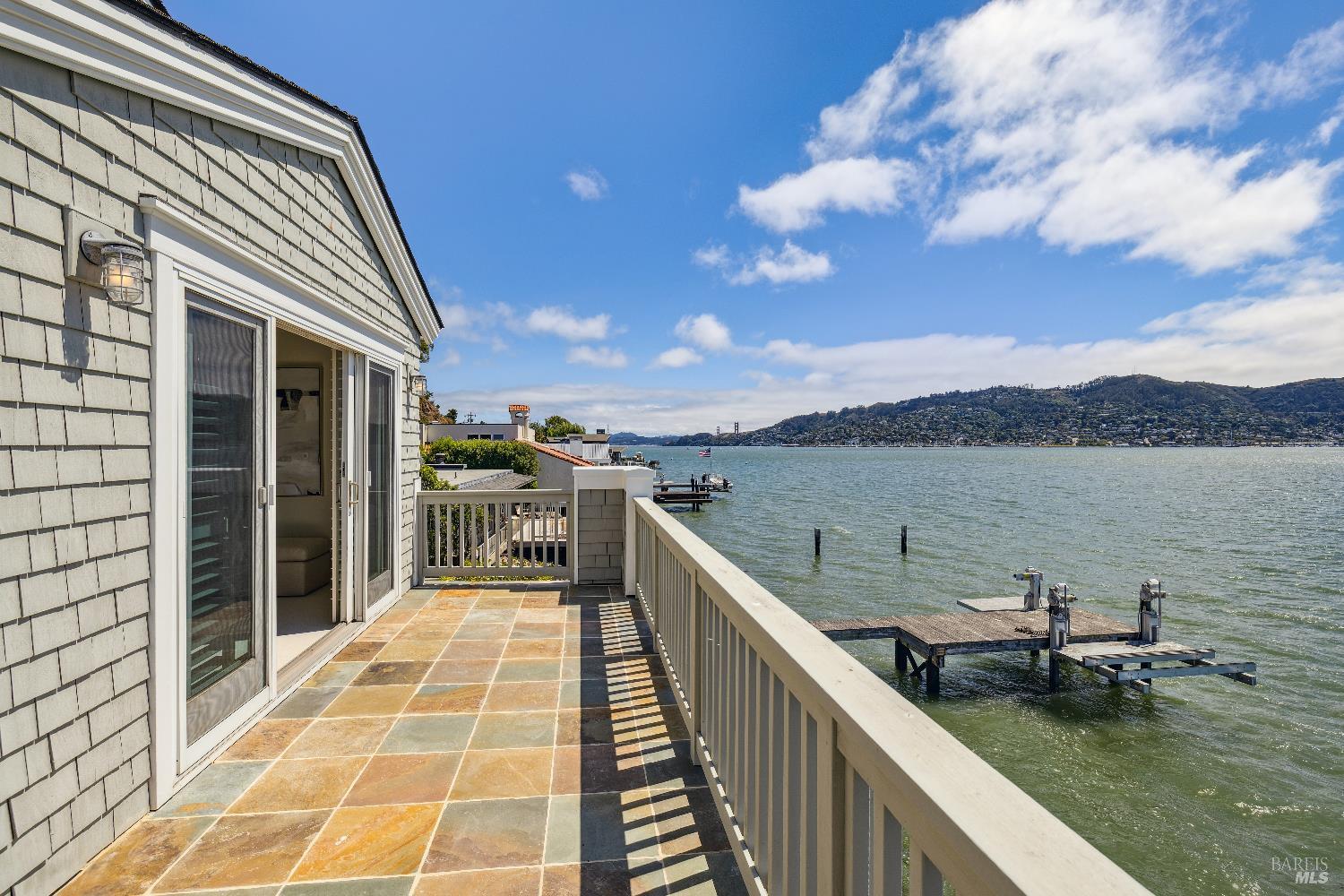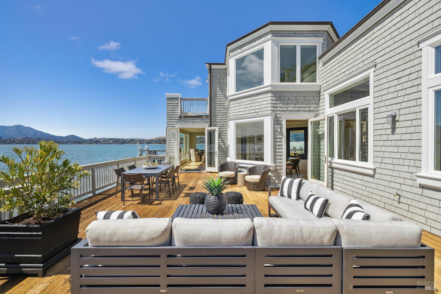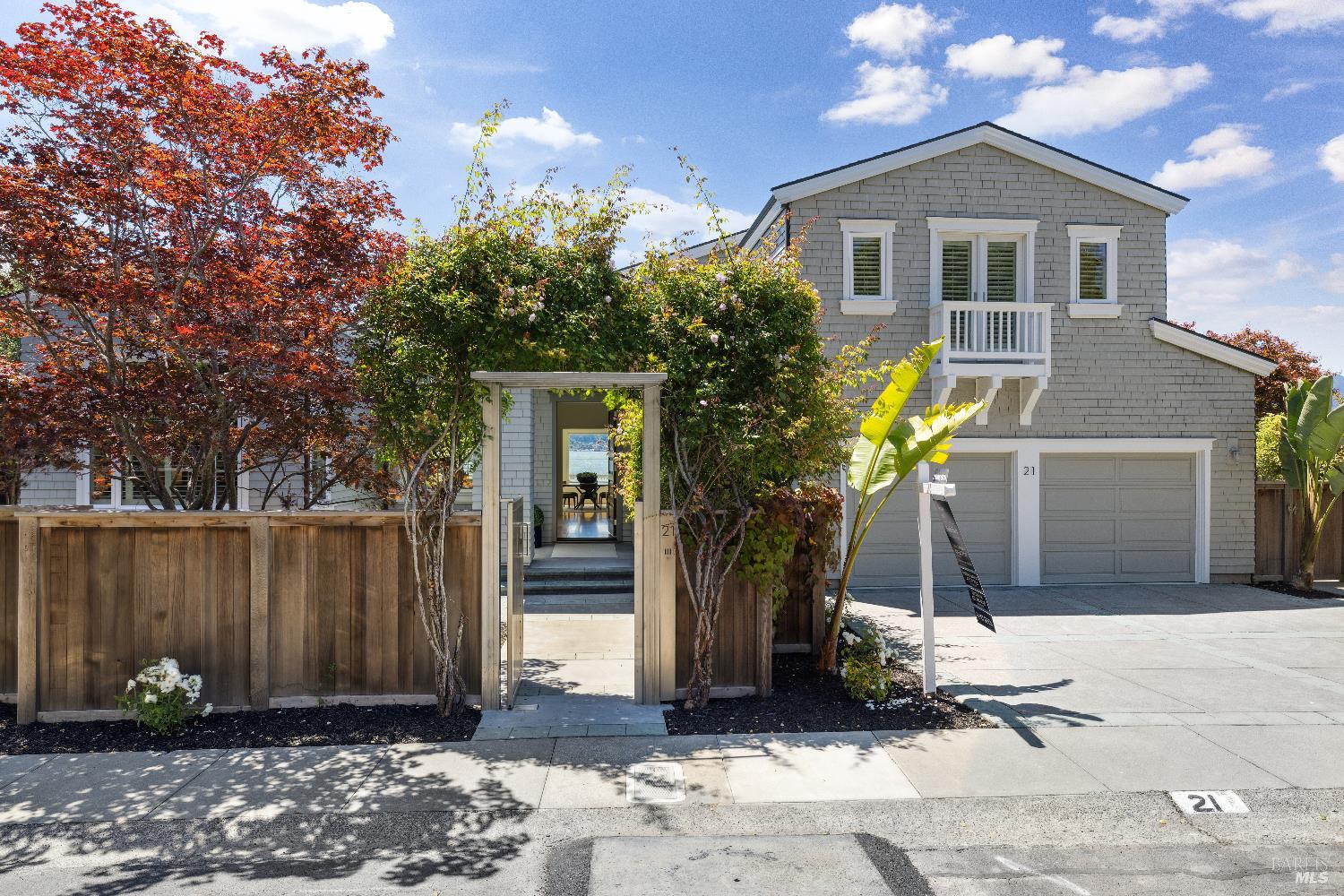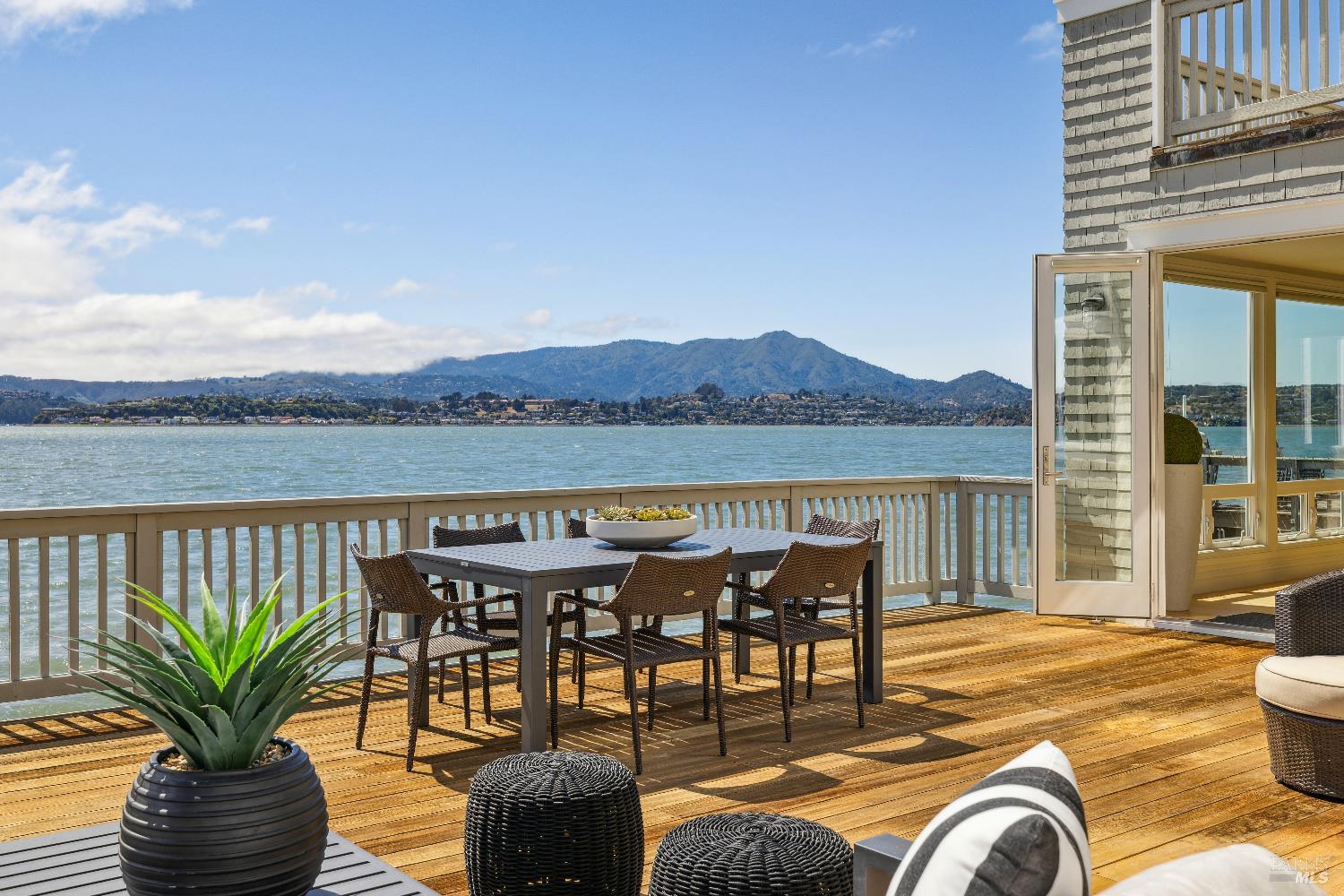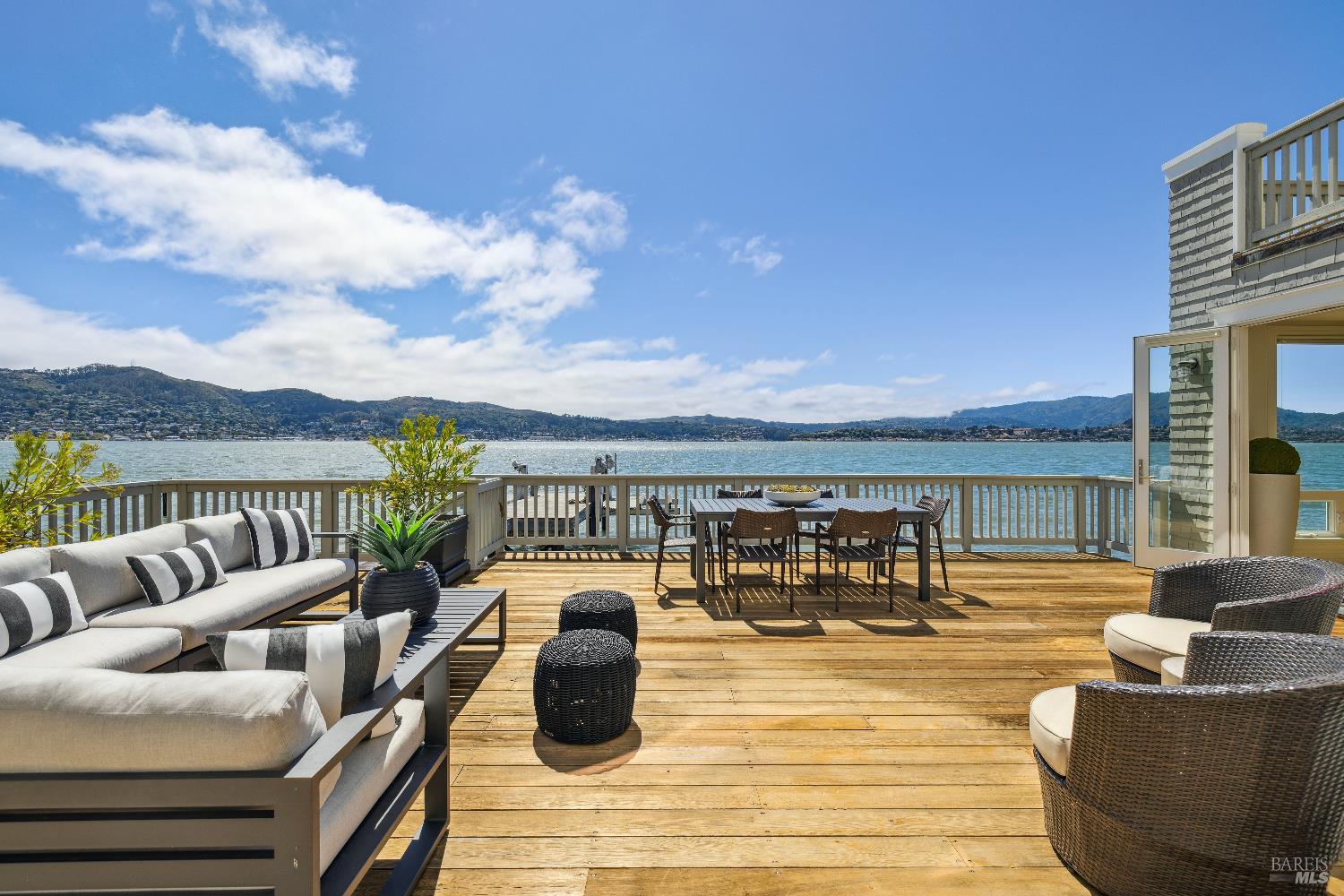 21 West Shore is one of Belvedere's most sought-after waterfront properties on Richardson Bay, with panoramic views of San Francisco, the Golden Gate Bridge, Sausalito, and Mount Tamalpais. Entered through a private gated garden, the grand entry and foyer opens to the living room with soaring ceilings and the dining room, both showcasing water views that command attention and pause. Ideal for entertaining and modern living, there is an open plan kitchen, breakfast area, family room, and game room with adjacent wet bar and wine cellar. The main level also features a view-side office/library, an ensuite bedroom, powder room, and an expansive deck leading to a private dock.