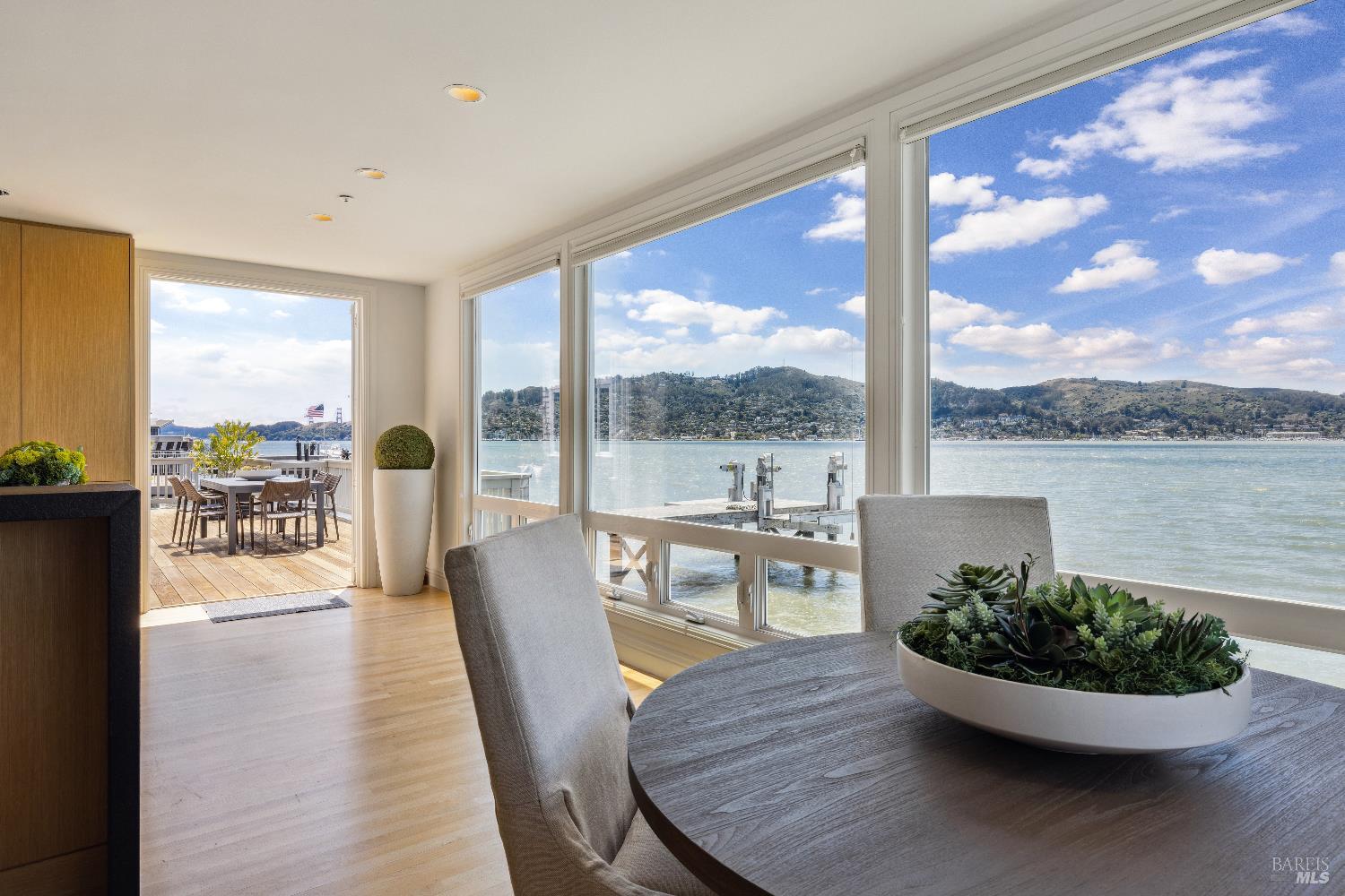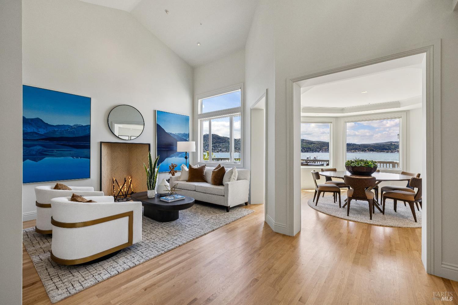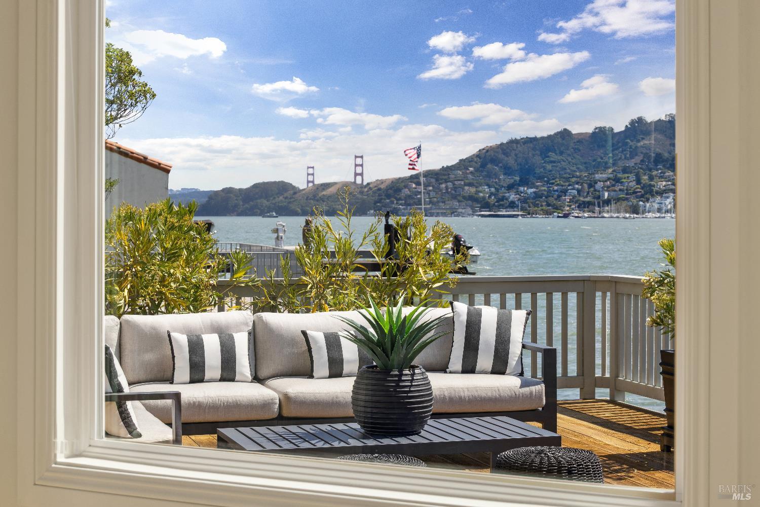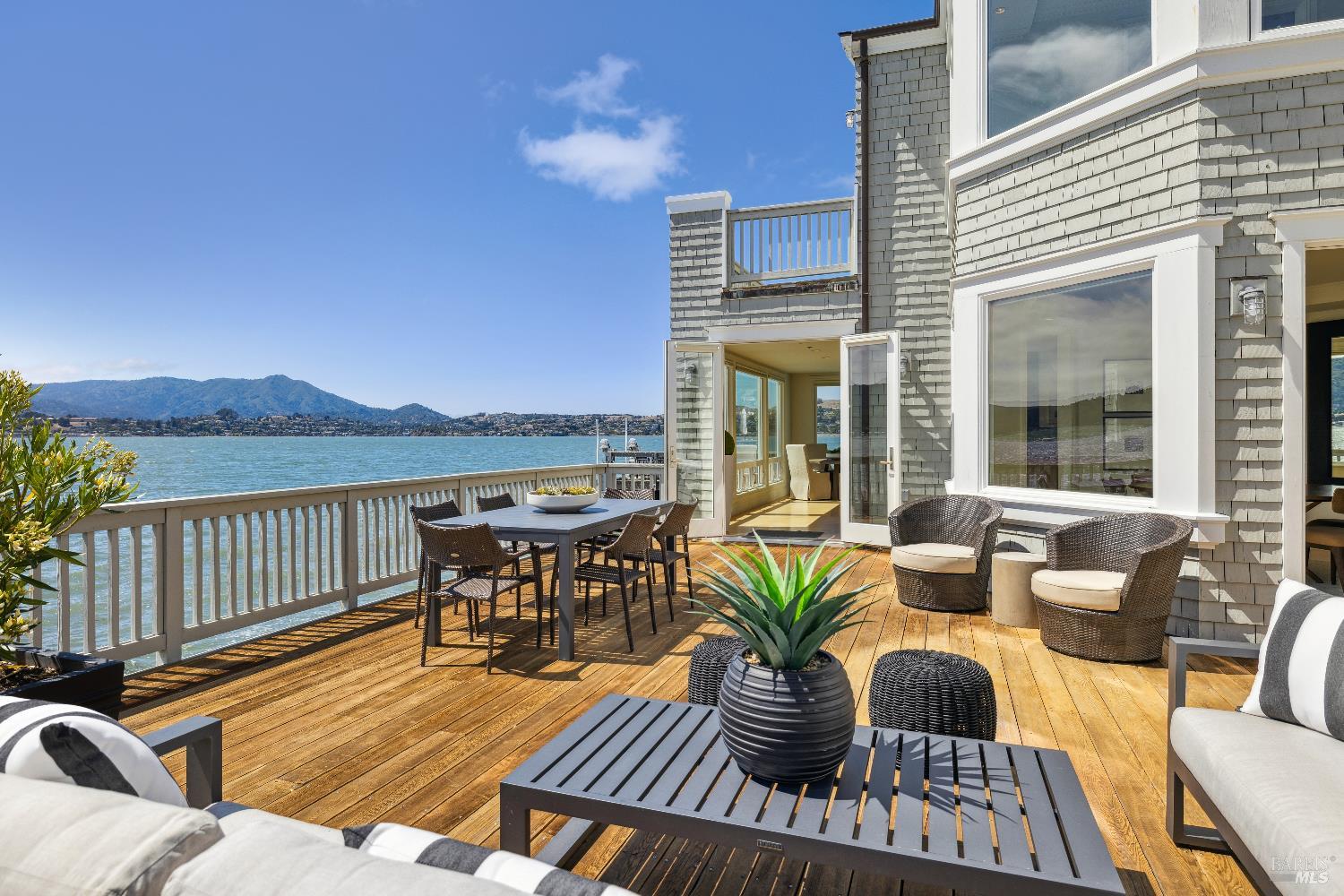 21 West Shore is one of Belvedere's most sought-after waterfront properties on Richardson Bay, with panoramic views of San Francisco, the Golden Gate Bridge, Sausalito, and Mount Tamalpais. Entered through a private gated garden, the grand entry and foyer opens to the living room with soaring ceilings and the dining room, both showcasing water views that command attention and pause. Ideal for entertaining and modern living, there is an open plan kitchen, breakfast area, family room, and game room with adjacent wet bar and wine cellar. The main level also features a view-side office/library, an ensuite bedroom, powder room, and an expansive deck leading to a private dock.