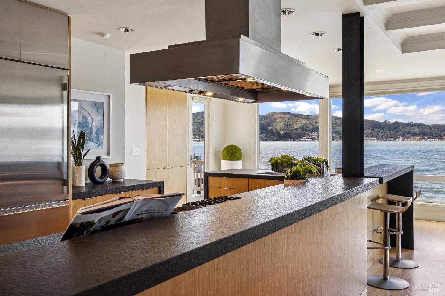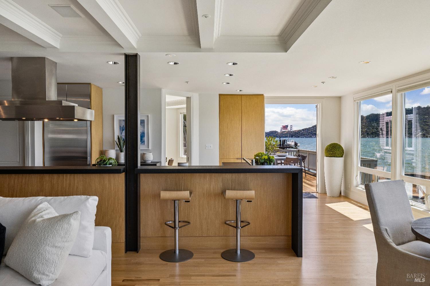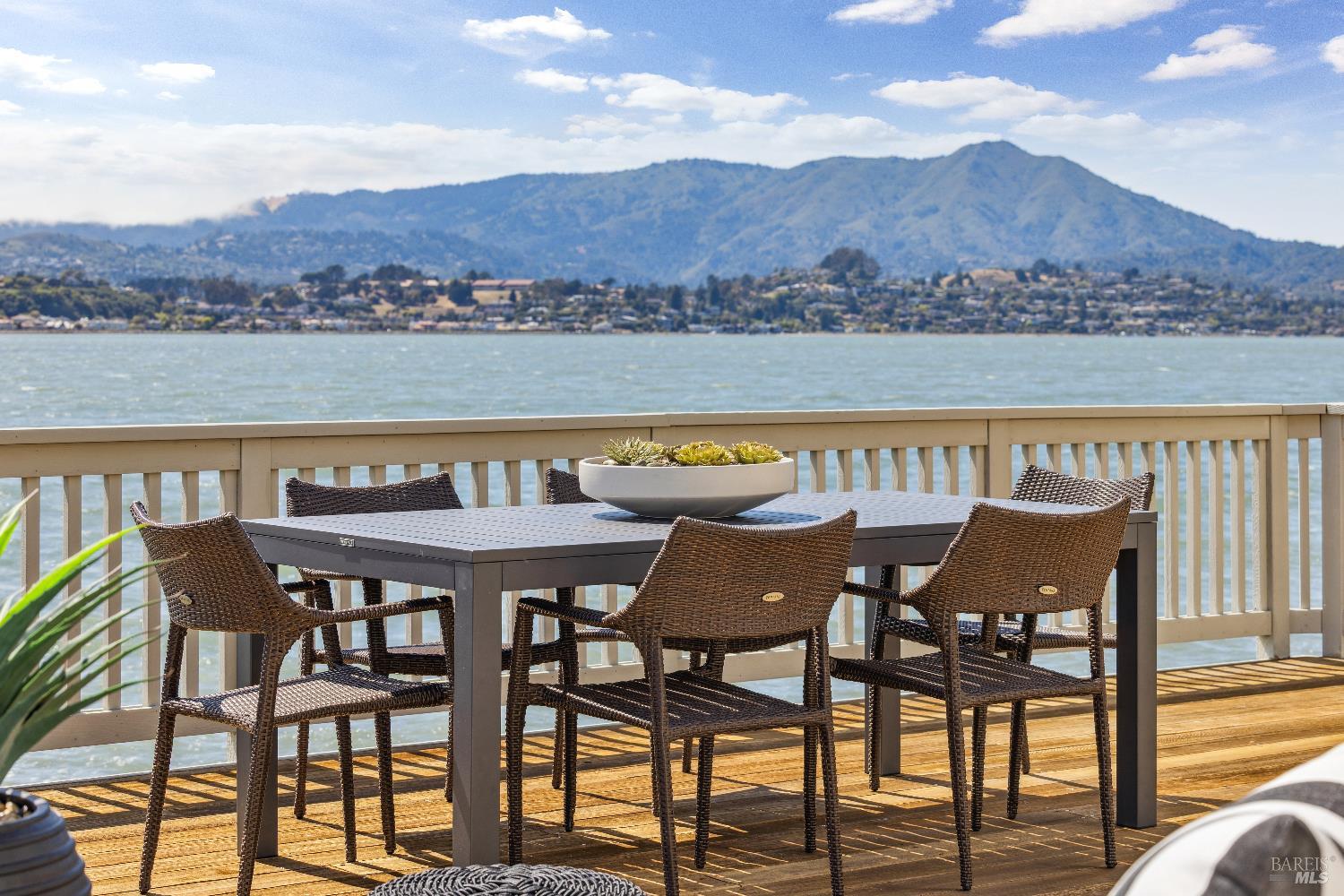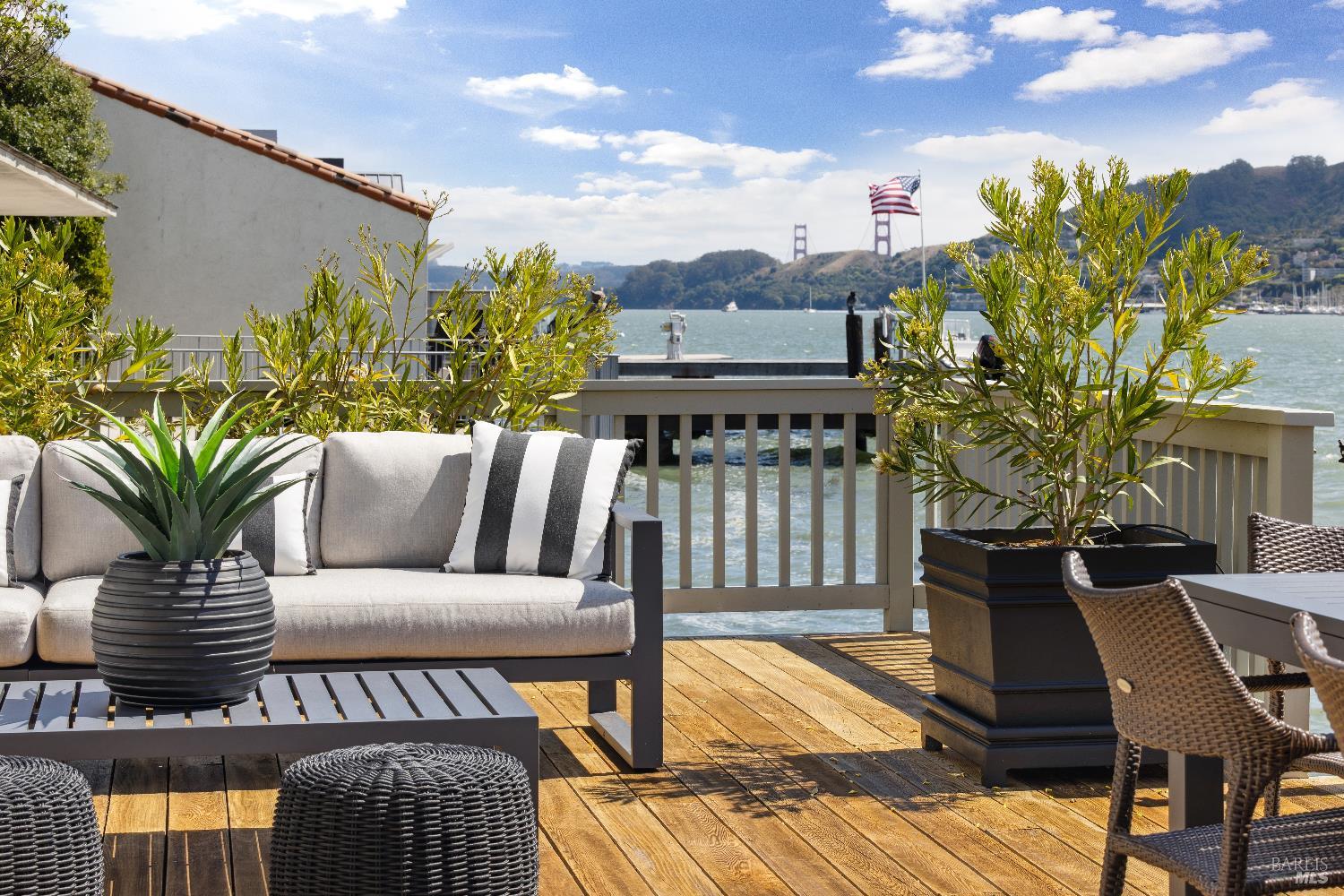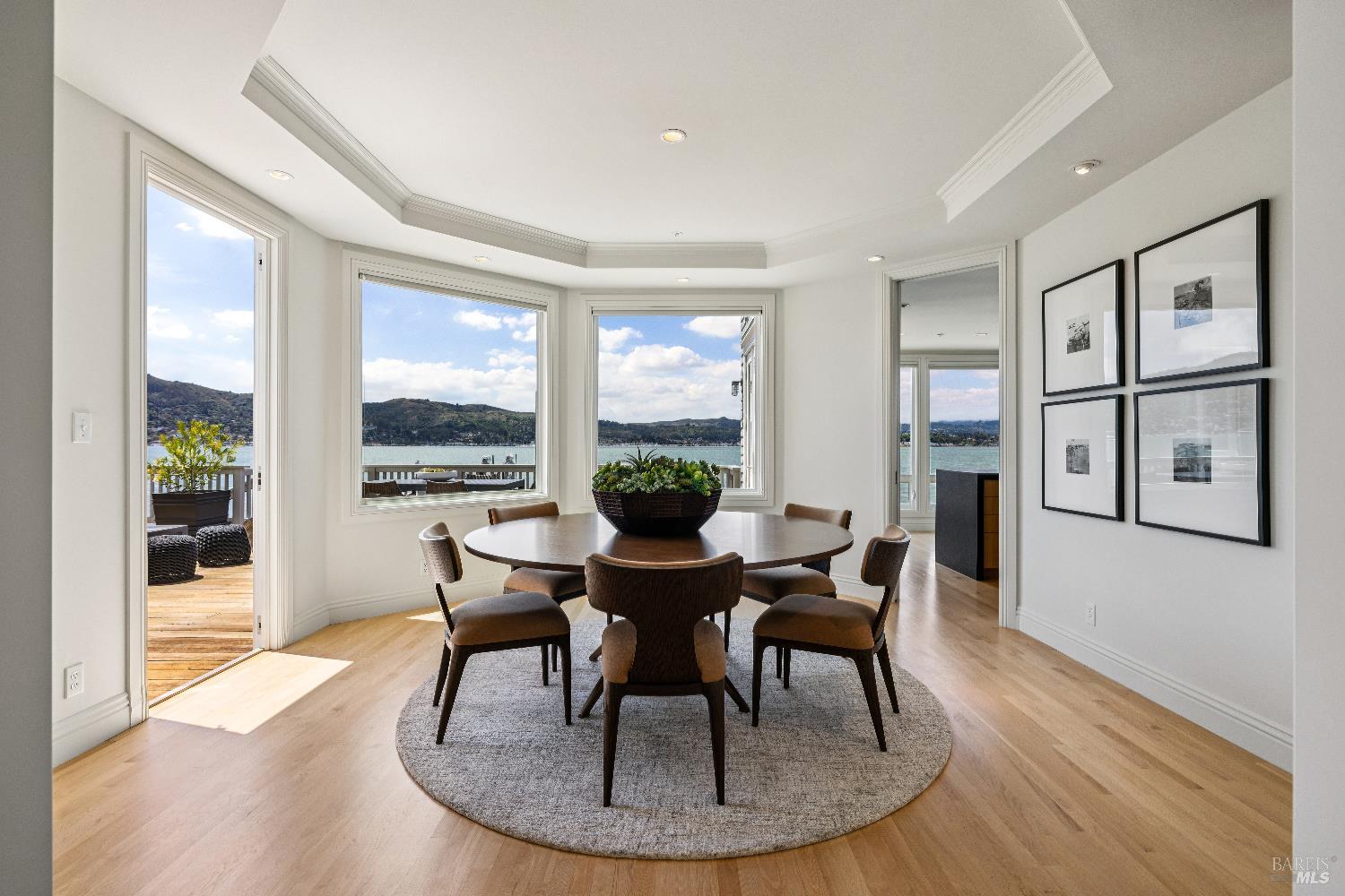 21 West Shore is one of Belvedere's most sought-after waterfront properties on Richardson Bay, with panoramic views of San Francisco, the Golden Gate Bridge, Sausalito, and Mount Tamalpais. Entered through a private gated garden, the grand entry and foyer opens to the living room with soaring ceilings and the dining room, both showcasing water views that command attention and pause. Ideal for entertaining and modern living, there is an open plan kitchen, breakfast area, family room, and game room with adjacent wet bar and wine cellar. The main level also features a view-side office/library, an ensuite bedroom, powder room, and an expansive deck leading to a private dock.