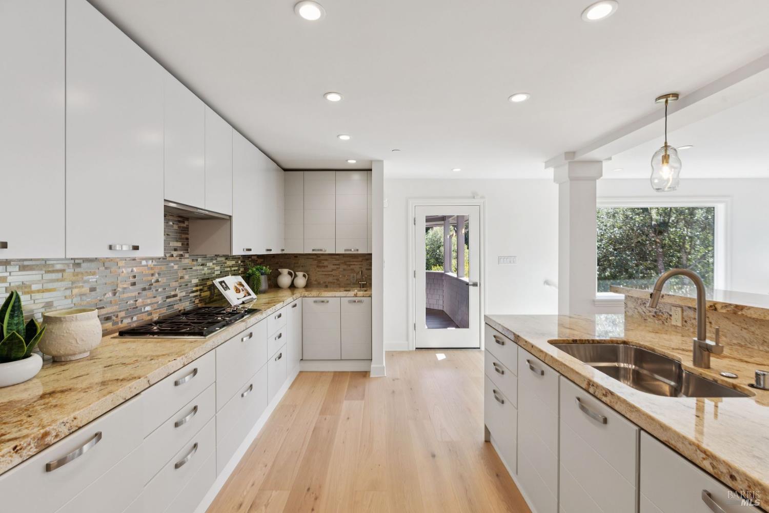 The 4,000 sq ft contemporary home has been extensively upgraded & thoughtfully designed for comfort & entertaining. The 5BD/4BA residence features hardwood floors, renovated baths, skylights flooding interiors w/ natural light & multiple view decks for seamless indoor/outdoor living. The open-concept kitchen w/ Calacatta stone flows to the family rm, breakfast area & adjoining living space. The primary suite upstairs lives like a retreat, while 3 additional BRs are together on the main level. A custom-built library w/ en suite bath doubles as office or guest quarters. Wellness amenities include a private sauna and spa, while gated and fenced grounds ensure privacy.