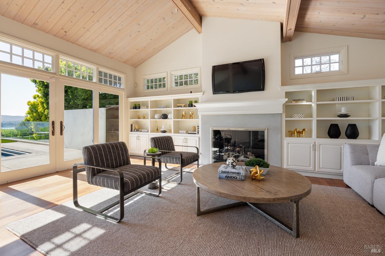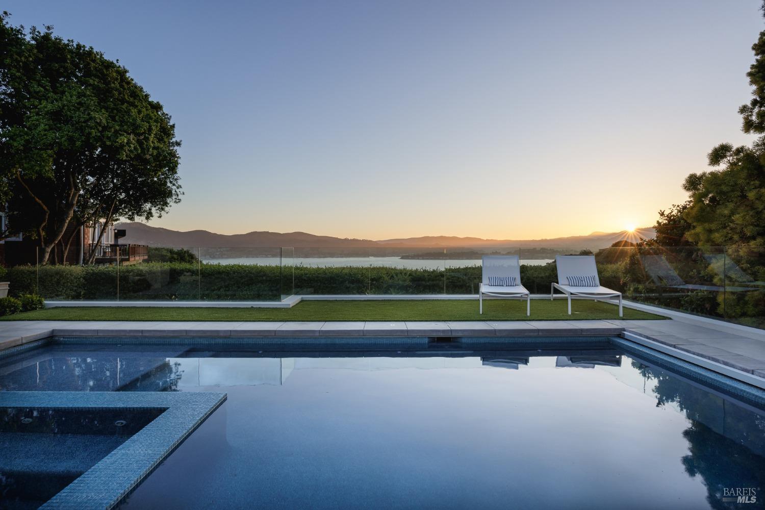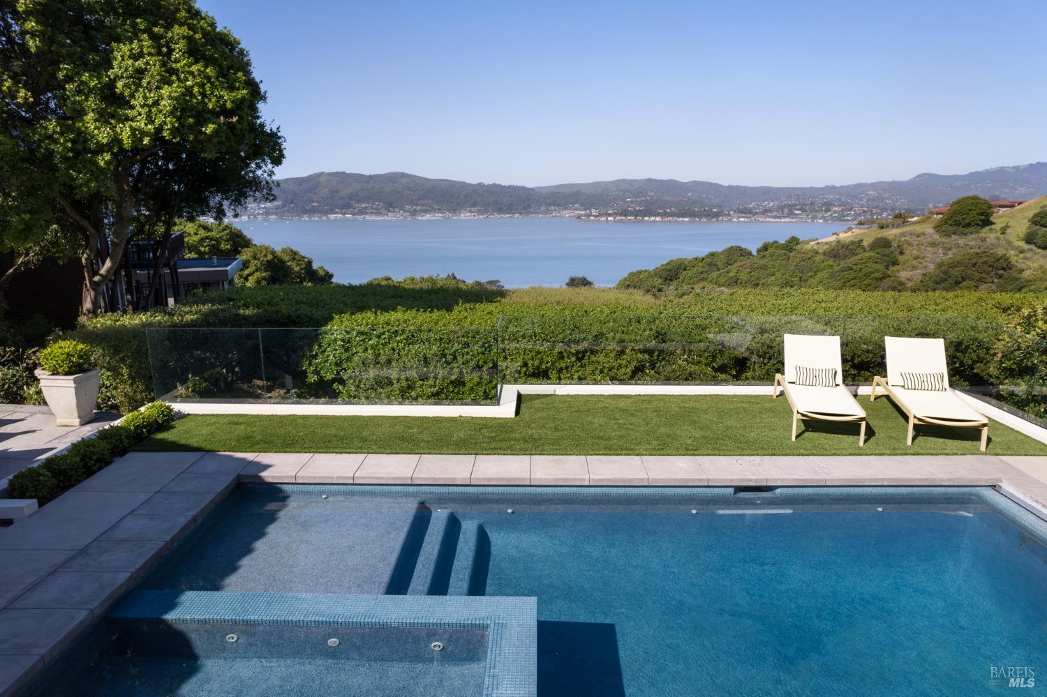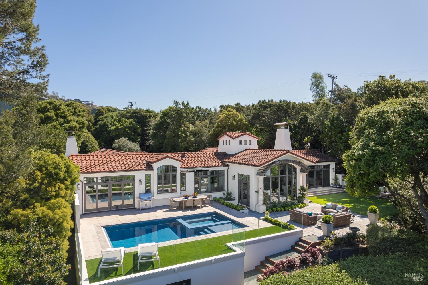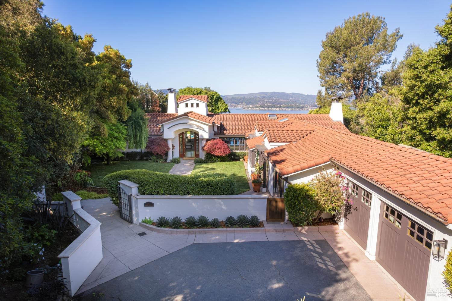 Experience the allure of this idyllic single story retreat, showcasing outstanding resort style living spaces, and mesmerizing views of the bay,Sausalito, and the rolling hills of Marin. Enriched by a seamless blend of Santa Barbara and Montecito influences, this residence exudes timeless beauty and embodies the coastal ambiance synonymous with the seaside lifestyle of the Tiburon Peninsula. Picturesque grounds with new pool and spa, entertainment terraces, turf lawn, pristine landscaping, and a gated front courtyard with lush lawns. Arched doorways & windows, high ceilings, Brazilian cherry hardwood flooring, and wood beamed ceilings. The elegant grand-scale living room features high ceilings, a fireplace, access to the outdoors, and an impressive floor-to-ceiling bay window that captures picturesque views. Stunning kitchen with center island, an extended breakfast bar, built-in desk, and high end appliances. Adjacent family room with stunning views, and access to the pool and backyard. Nestled in a private wing, the primary suite boasts a walk-in closet with a custom wardrobe system, vaulted ceilings, a lavish primary bathroom, and glass doors opening to the outdoors. Two en-suite bedrooms, a recreation room (or 4th bedroom), bonus room with a full bathroom, and a dual office.