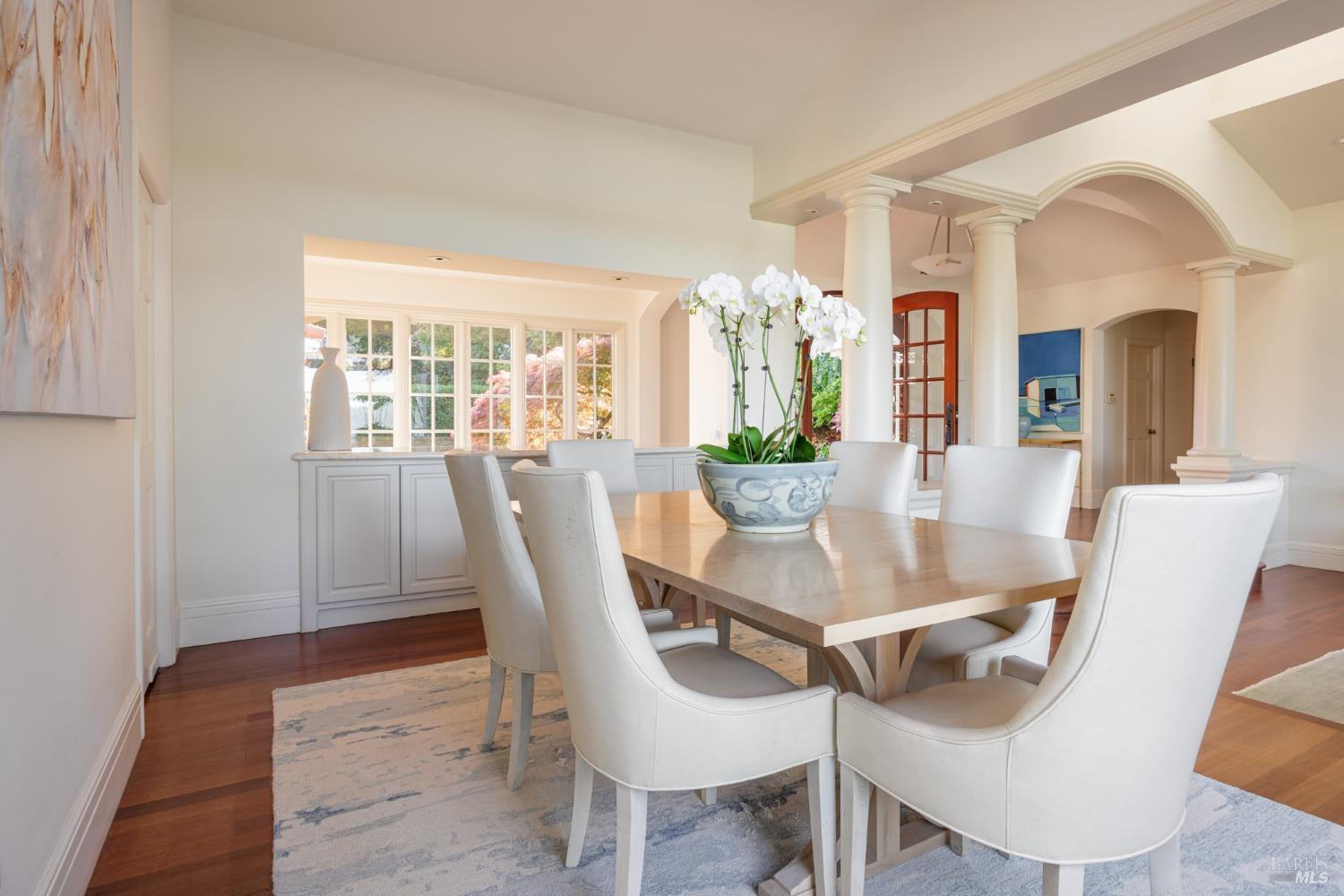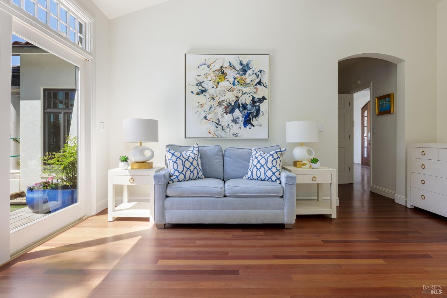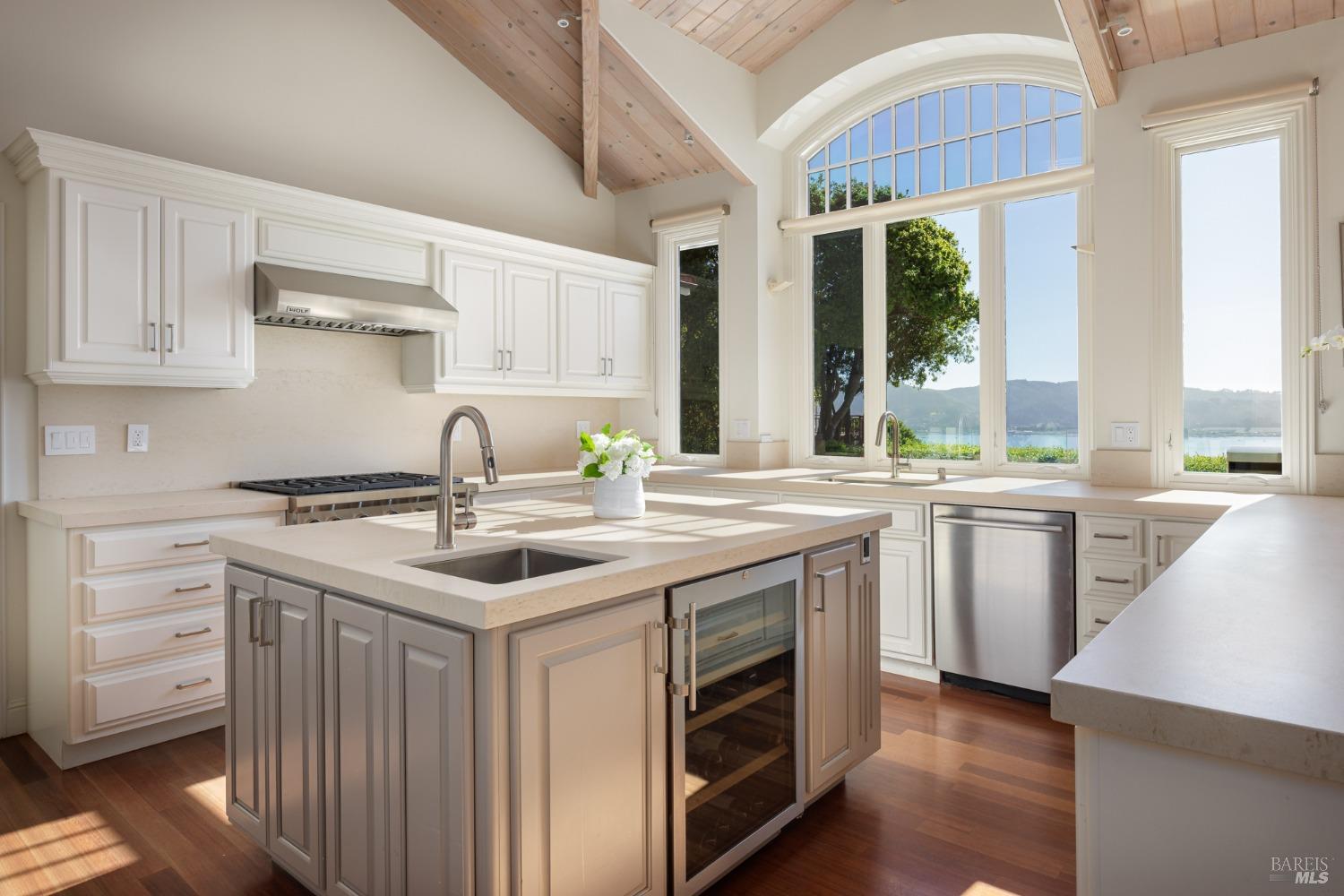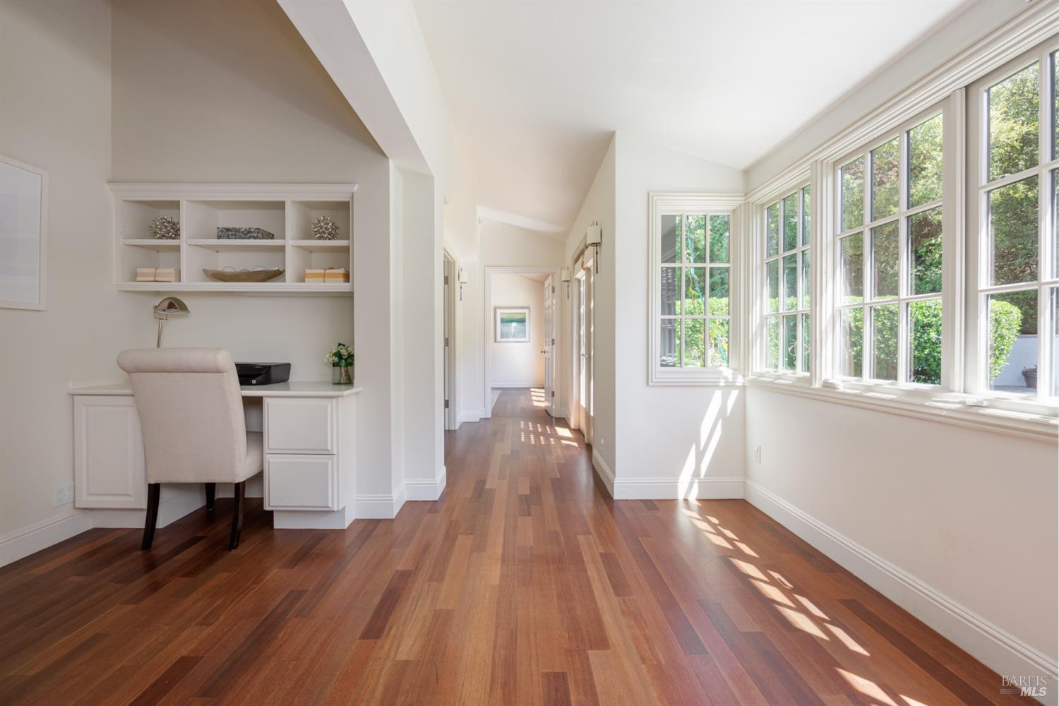 Experience the allure of this idyllic single story retreat, showcasing outstanding resort style living spaces, and mesmerizing views of the bay,Sausalito, and the rolling hills of Marin. Enriched by a seamless blend of Santa Barbara and Montecito influences, this residence exudes timeless beauty and embodies the coastal ambiance synonymous with the seaside lifestyle of the Tiburon Peninsula. Picturesque grounds with new pool and spa, entertainment terraces, turf lawn, pristine landscaping, and a gated front courtyard with lush lawns. Arched doorways & windows, high ceilings, Brazilian cherry hardwood flooring, and wood beamed ceilings. The elegant grand-scale living room features high ceilings, a fireplace, access to the outdoors, and an impressive floor-to-ceiling bay window that captures picturesque views. Stunning kitchen with center island, an extended breakfast bar, built-in desk, and high end appliances. Adjacent family room with stunning views, and access to the pool and backyard. Nestled in a private wing, the primary suite boasts a walk-in closet with a custom wardrobe system, vaulted ceilings, a lavish primary bathroom, and glass doors opening to the outdoors. Two en-suite bedrooms, a recreation room (or 4th bedroom), bonus room with a full bathroom, and a dual office.