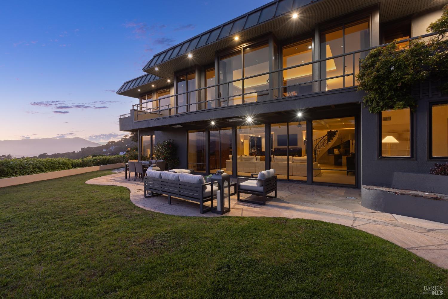 Experience panoramic vistas from this elegant Tiburon residence. Spanning approximately 5,449 sq ft on nearly half an acre, this home offers 4 bedrooms, 3.5 bathrooms, and an office. The main level features a primary suite, office, kitchen, breakfast room, formal living and dining rooms, and garage access. The lower level includes a family room, bar, laundry room, den, two full bathrooms, and a flexible two- or three-bedroom configuration. Custom artisan details are evident throughout, including an etched glass entry door, bespoke interior doors, a handcrafted library, and distinctive fireplace surrounds. Multiple outdoor terraces provide ideal spaces for entertaining, all set against the backdrop of sweeping views of the Bay Bridge, San Francisco skyline, Golden Gate Bridge, and Mount Tamalpais. Located within the esteemed Reed Union School District.